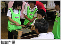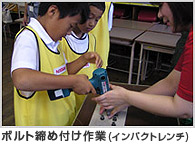 工場で実際に使用している機材や技能教育用に使用している教材を教室に持ち込み、現場熟練社員の指導の下、モノづくり体験を してもらいます。インパクトレンチやトルクレンチを使ってナットの締め付けをしたり、ハンマーで金属板をたたいて、板金の体験を するなど、モノづくりを五感(目・耳・手)で楽しめるプログラムです。