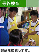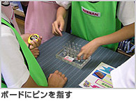第1部では7~8人で1つのチームを作り、NISSANフレンド号をチームで協力して組み 立てていく擬似組立体験を通して、「改善(カイゼン)活動」を体験します。チームの 各メンバーはそれぞれ「組立(4工程)」「物流」「最終検査」「計測」という役割分担を 行います。グループごとにクルマの組立タイムを競う中で、効率的な生産のための 創意工夫(カイゼン)を学びます。